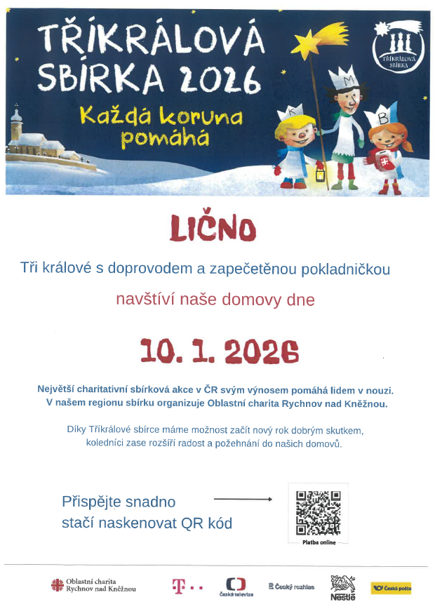 Tři králové s doprovodem a zapečetěnou pokladničkou navštíví Vaše domovy v sobotu 10.ledna 2026.